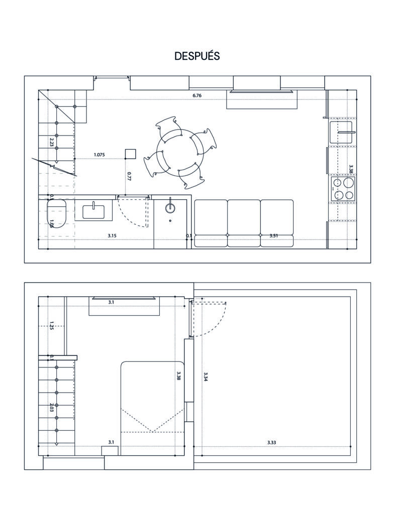 Gracias a los 30 días que ha durado el proyecto de reforma, el dúplex se ha revalorizado un 25% y además se ha transformado en una moderna vivienda con la cocina abierta al salón en la planta inferior y una cómoda habitación con terraza en la planta alta.